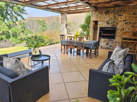 Social gathering on the large patio with build-in braai and spectacular views down the valley on to the runway and dams makes relaxing and unwinding a given treat. The indoor entertainment area with wood-fired pizza oven, fireplace, flatscreen TV, large leather couch and bar-height solid-wood dining table makes the ideal place to share unforgettable moments and create meaningful memories for life!